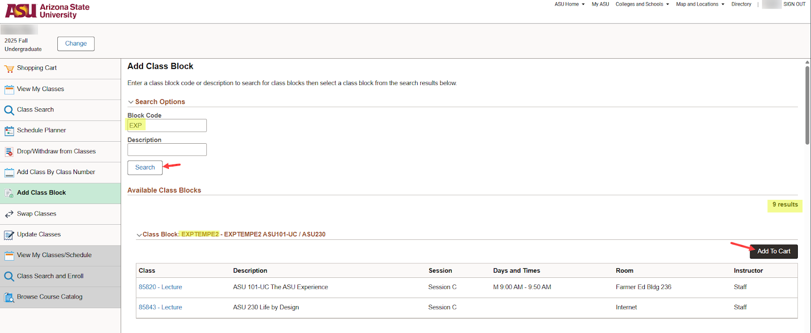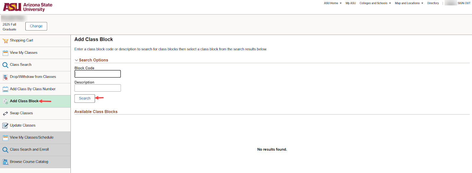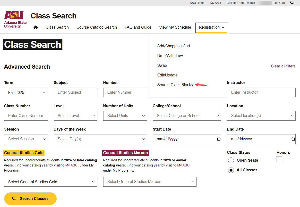 Student Navigation: My ASU>Class Search>Advanced Class Search>Registration menu>Search Class Blocks