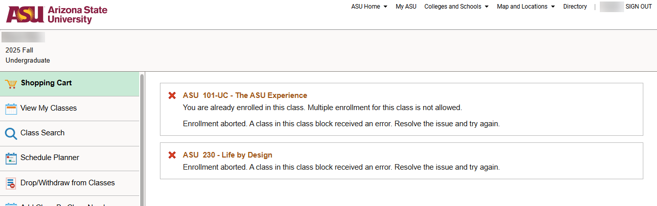 • After clicking Enroll, the student is provided a message for each class in the class block (and